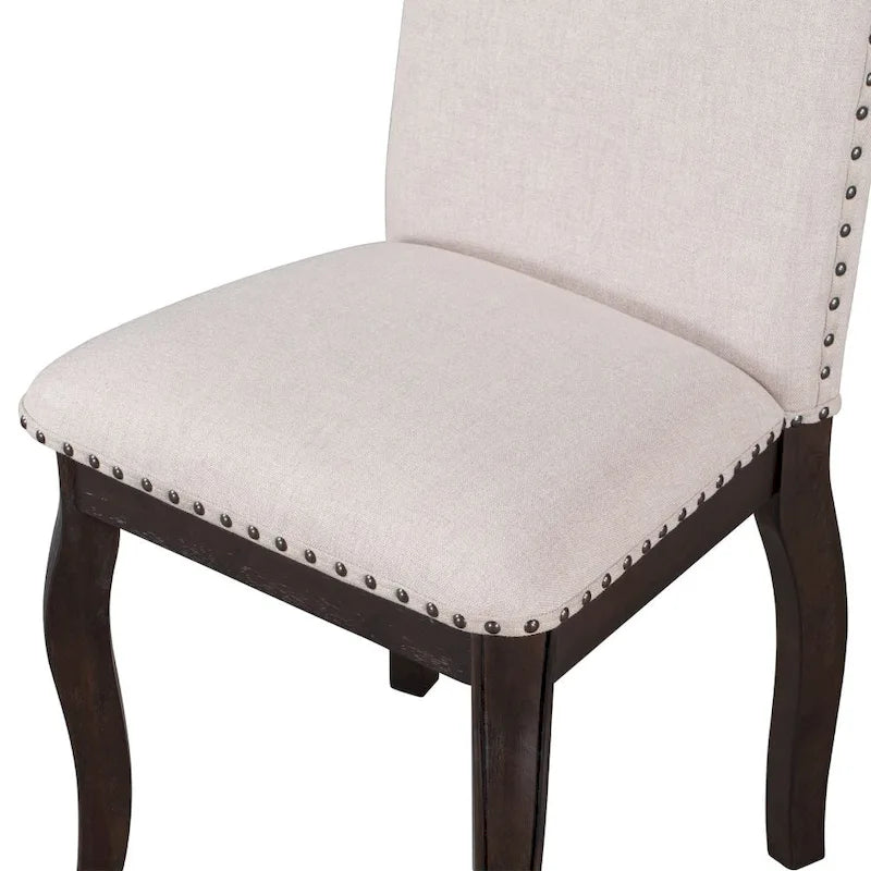 Aggiungi un tocco di fascino ed eleganza alla tua sala da pranzo con il nostro set da 5 tavoli da pranzo in stile rustico. Realizzato in MDF e legno di caucciù con impiallacciature in legno di acacia, questo set presenta un piano rotondo con una graziosa texture in legno naturale e speciali gambe curve, perfette per sale da pranzo in stile rustico o moderno. La base a X, i tenoni passanti e i piccoli tasselli in legno sul bordo del piano rendono il tavolo robusto e durevole. Inoltre, la lunghezza regolabile consente flessibilità in stanze di qualsiasi dimensione. Il set include 4 sedie imbottite con schienale alto, cuscini profondi e dettagli con borchie in bronzo anticato, che possono ospitare comodamente fino a 4 persone.