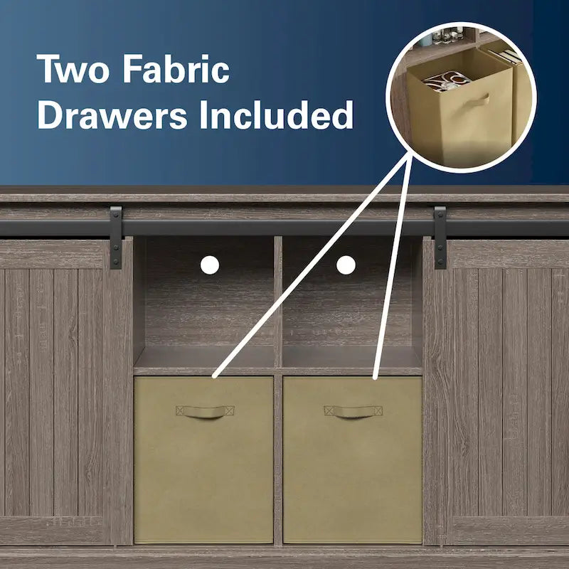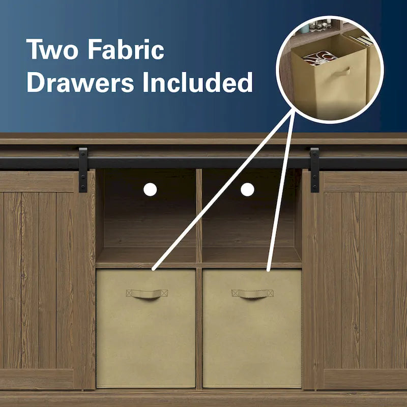 Mobile porta TV da 60" in stile fattoria, con ante scorrevoli in stile fienile, per TV fino a 65", ripiani in MDF, 2 contenitori in tessuto, gestione dei cavi, intrattenimento