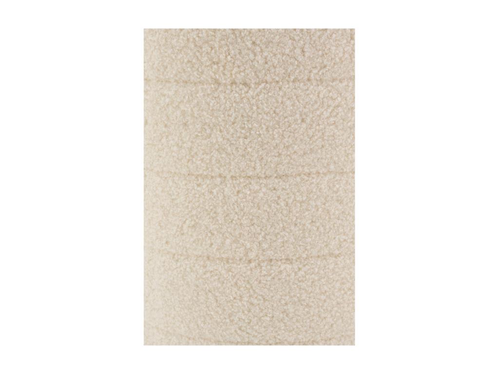 La combinazione di toni bianchi e dettagli in tessuto bouclé crea un'atmosfera accogliente e terrosa